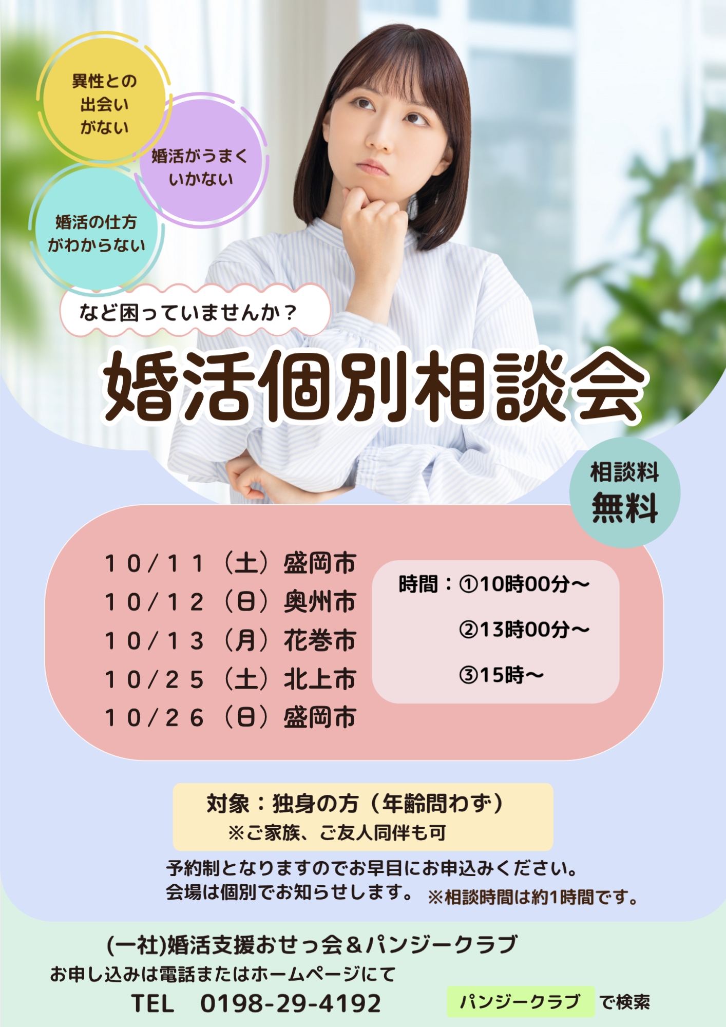 問い合わせ先 婚活支援おせっ会&パンジークラブ 〒028-0114 花巻市東和町土沢6-20-1 TEL 0198-29-4192(営業時間10:00~17:00)FAX 0198-29-4193 E-mail osekkai@pansy-club.jp  定休日水曜日