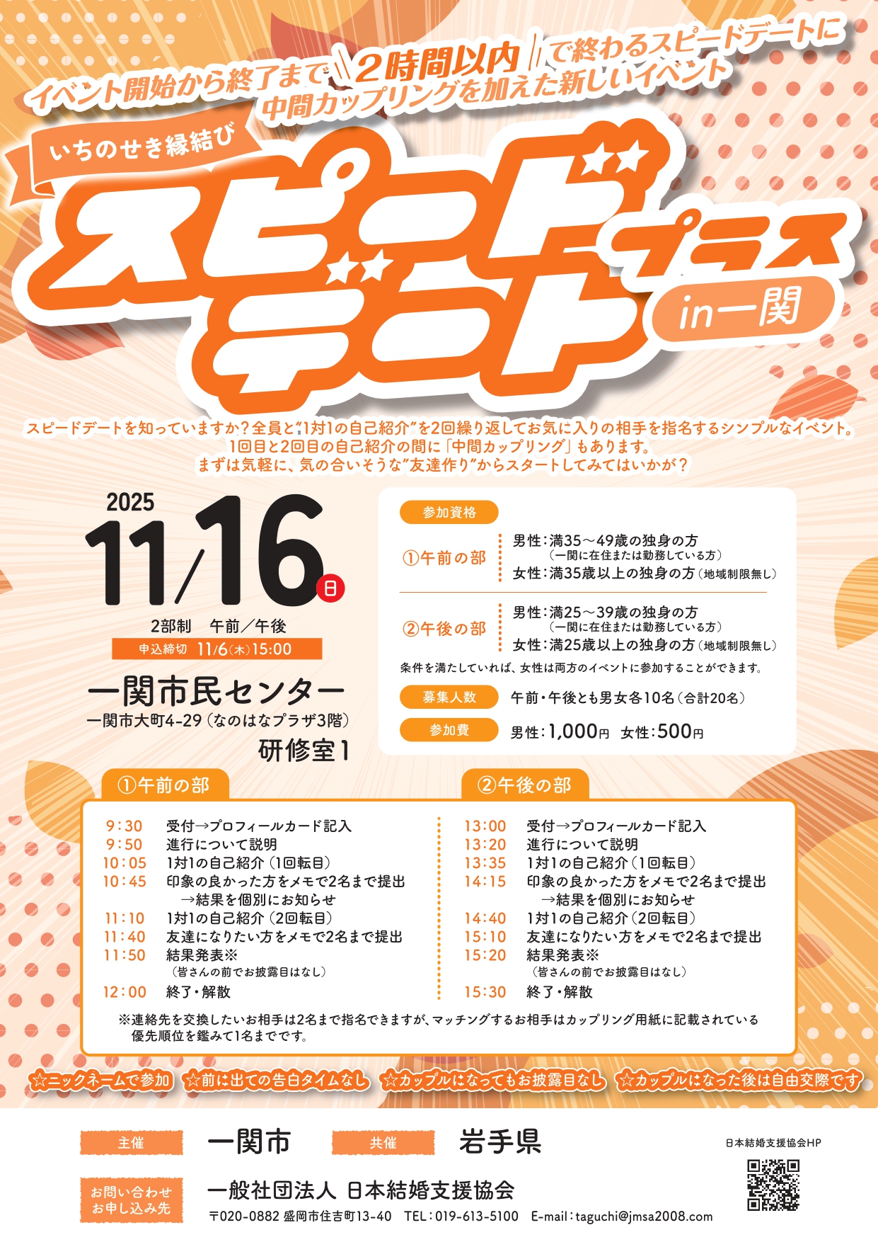 1.参加申込の際に頂戴した個人情報について、管理保管は一関市ならびに(一社)日本結婚支援協会が行います。