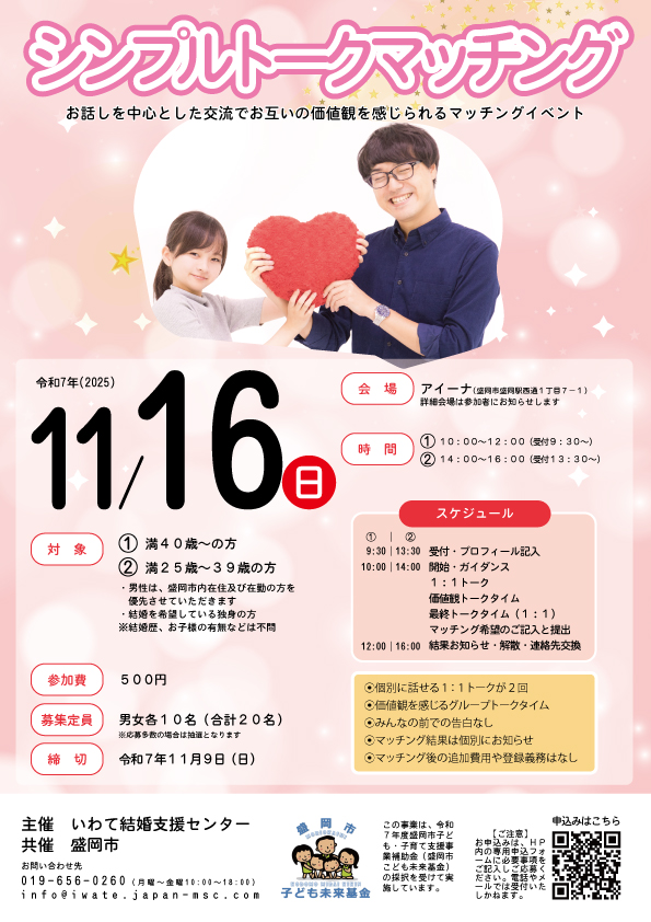 この事業「盛岡であい応援プロジェクト」は、いわて結婚支援センターが、盛岡市こども未来基金の採択を受けて実施しています。