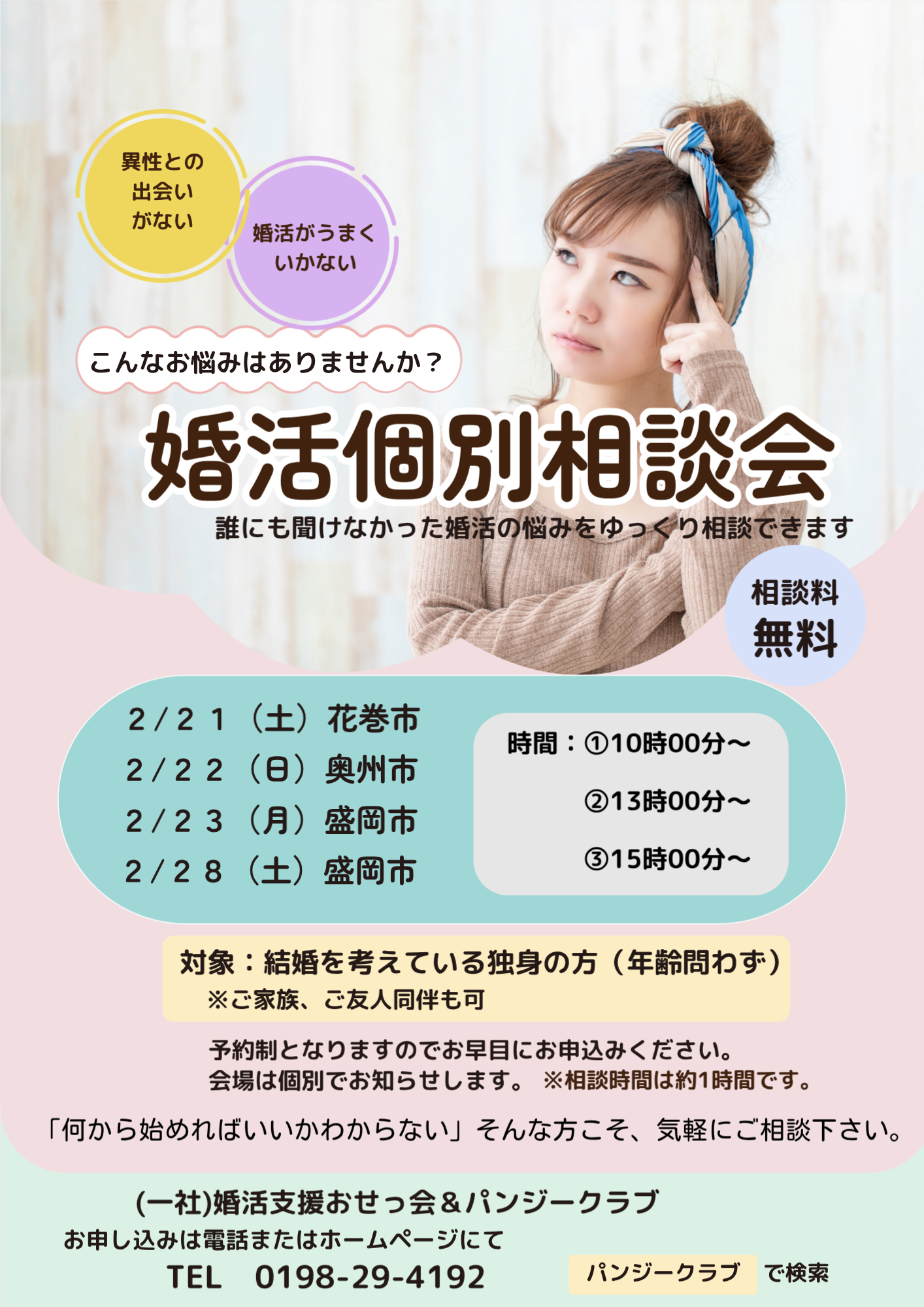 問い合わせ先 婚活支援おせっ会&パンジークラブ 〒028-0114 花巻市東和町土沢6-20-1 TEL 0198-29-4192(営業時間10:00~17:00)FAX 0198-29-4193 E-mail osekkai@pansy-club.jp  定休日水曜日