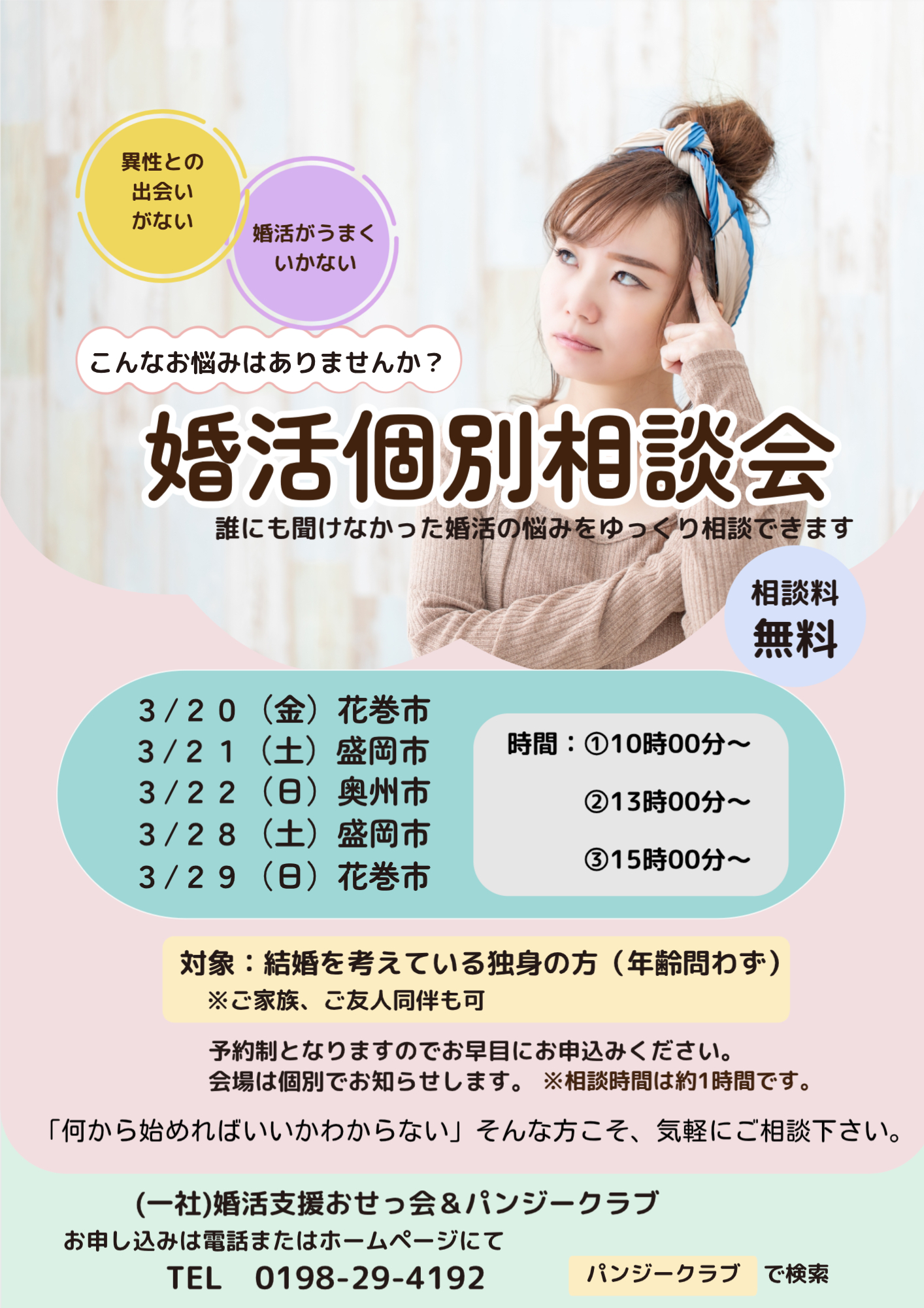 問い合わせ先 婚活支援おせっ会&パンジークラブ 〒028-0114 花巻市東和町土沢6-20-1 TEL 0198-29-4192(営業時間10:00~17:00)FAX 0198-29-4193 E-mail osekkai@pansy-club.jp  定休日水曜日