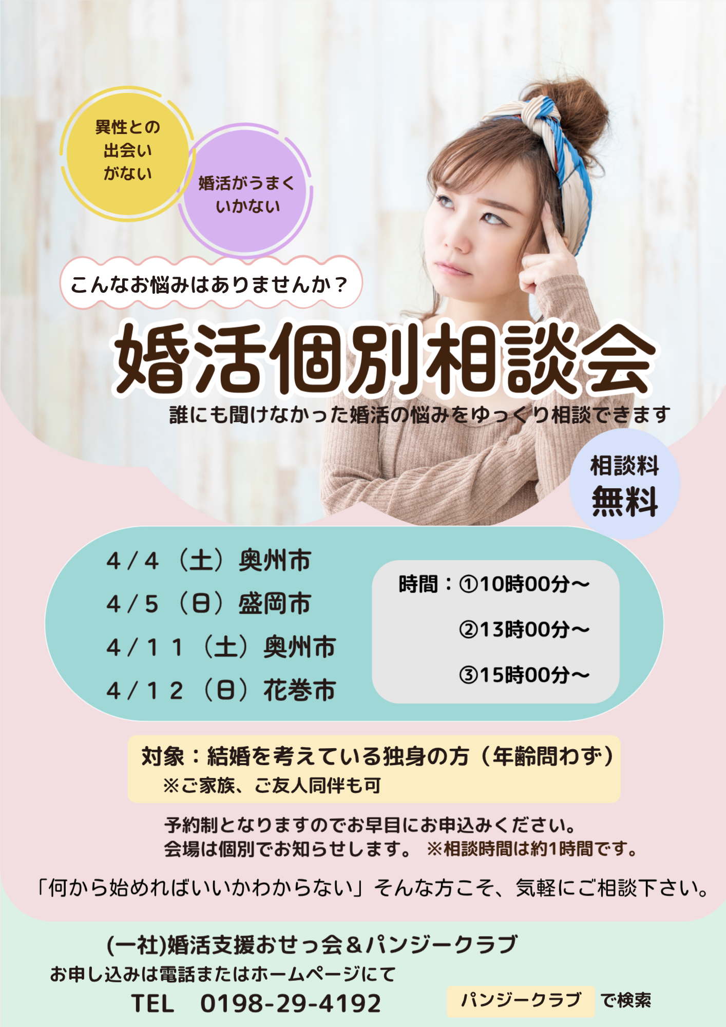 問い合わせ先 婚活支援おせっ会&パンジークラブ 〒028-0114 花巻市東和町土沢6-20-1 TEL 0198-29-4192(営業時間10:00~17:00)FAX 0198-29-4193 E-mail osekkai@pansy-club.jp  定休日水曜日
