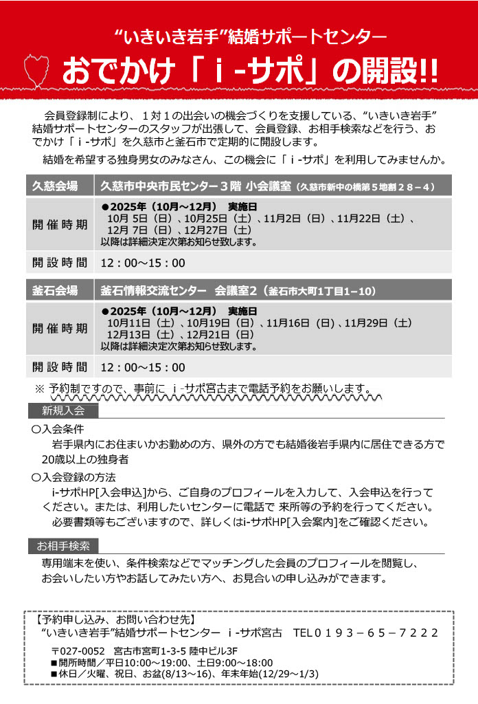 会員登録制により、1対1の出会いの機会づくりを支援している、“いきいき岩手”結婚サポートセンターのスタッフが出張して、会員登録、お相手検索などを行う、おでかけ「i‐サポ」を久慈市と釜石市で定期的に開設しています。