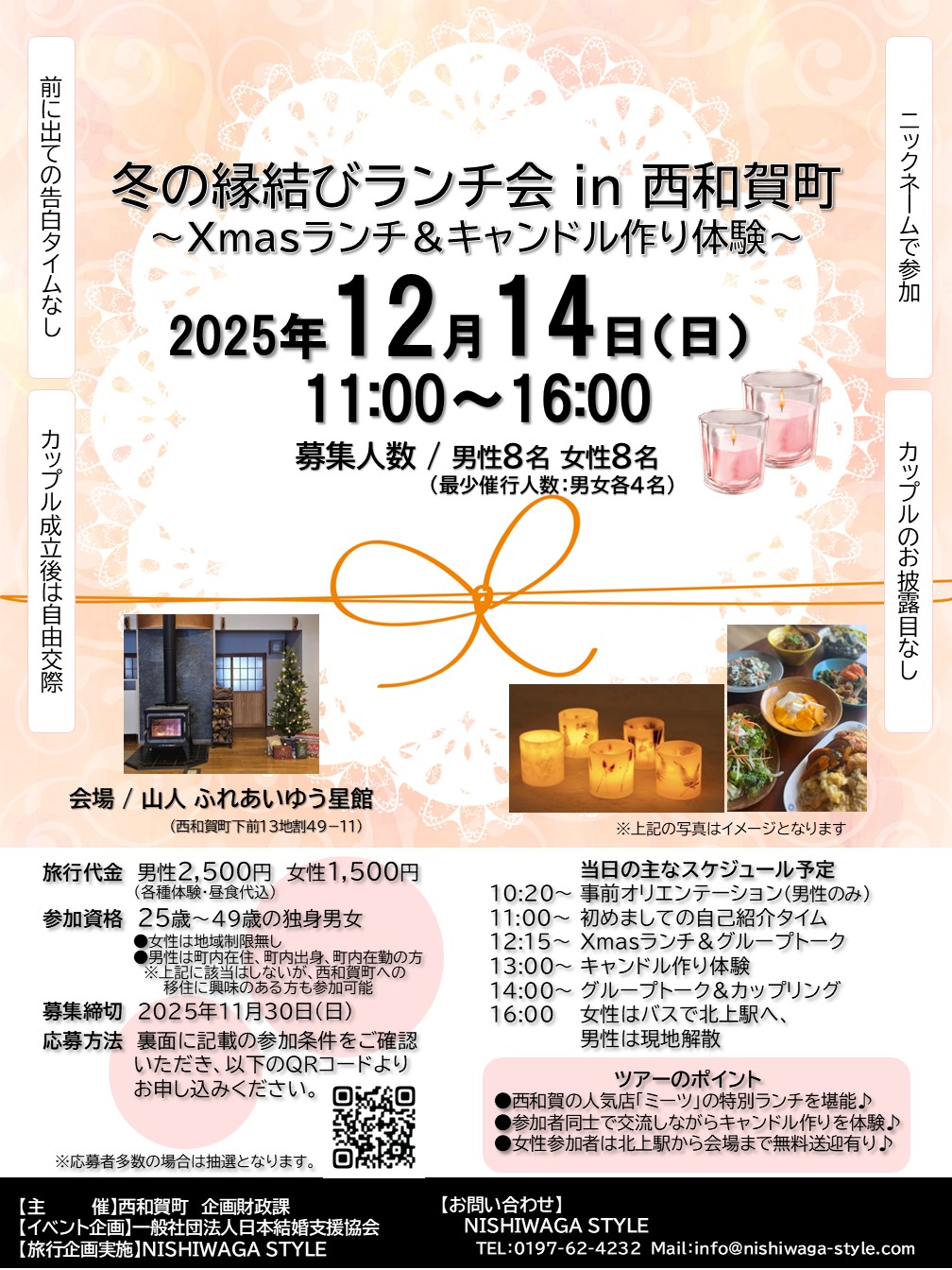 問い合わせ先 NISHIWAGA STYLE TEL:0197-62-4232Mail:info@nishiwaga-style.com または 一般社団法人 日本結婚支援協会 電話019-613-5100 メールtaguchi@jmsa2008.com