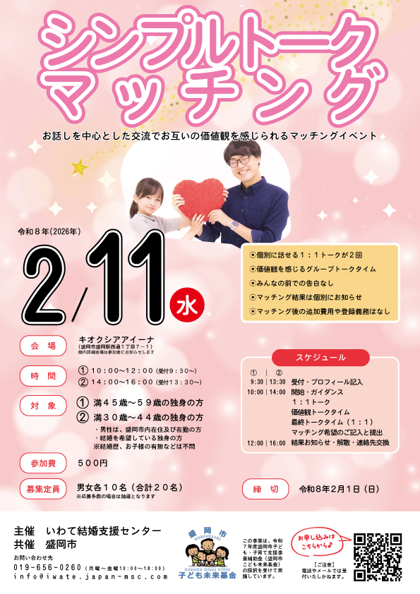 問い合わせ先 いわて結婚支援センター 〒020-0137 盛岡市天昌寺町9-43 TEL 019-656-0260(お問い合わせはメールにて承ります) E-mail info@iwate.japan-msc.com